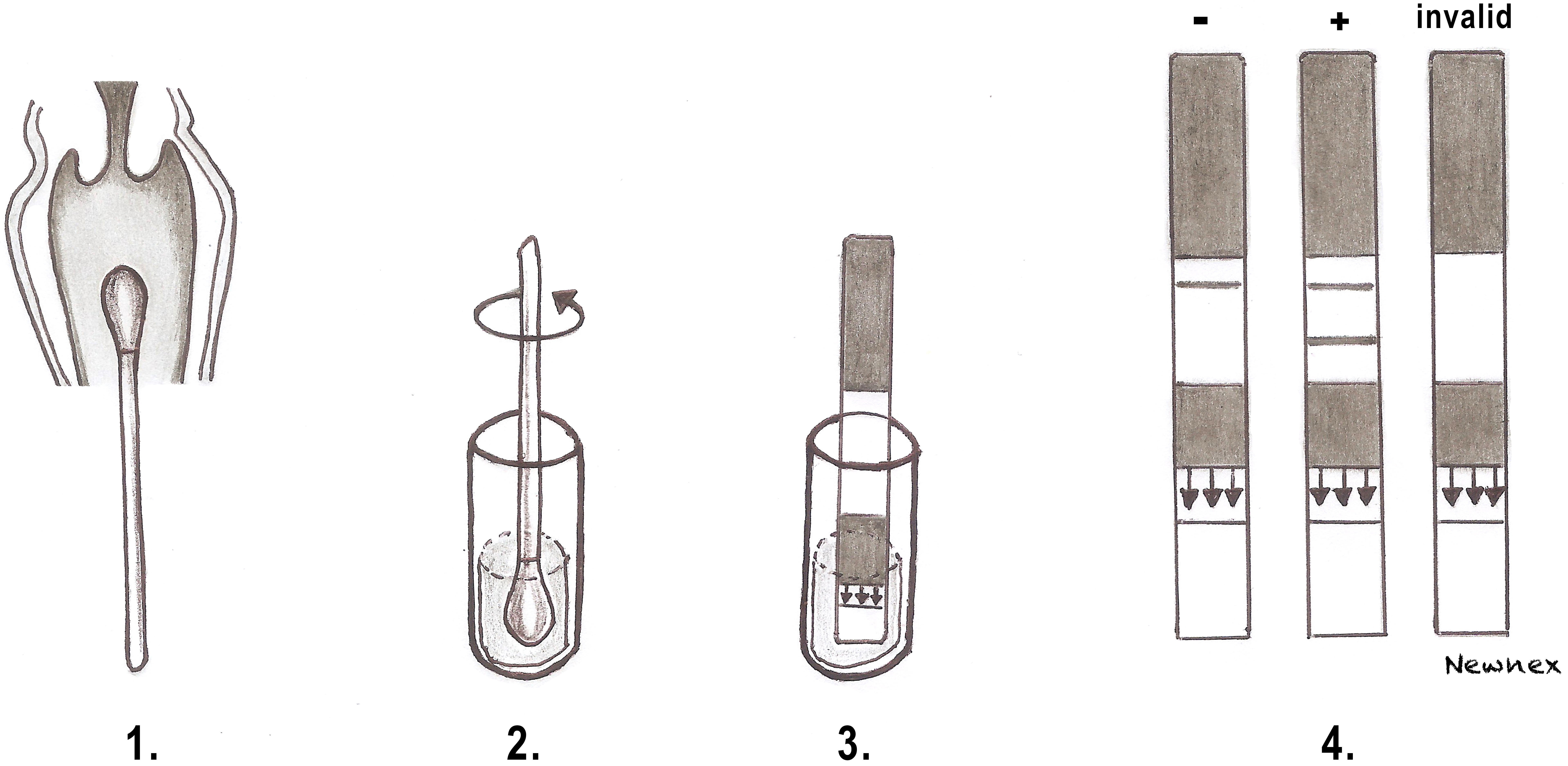 A sterile swab is inserted into the vagina for one minute and then placed into a vial containing a solvent that extracts protein from the swab. After one minute, an AmniSure test strip is dipped into the vial. The pad region of the test strip contains soluble murine monoclonal antibody to PAMG-1 that is conjugated with colloidal gold particles. These antibodies bind to PAMG-1, if it is present. The antigen-antibody complex migrates to the test region of the strip, which contains solid phase rabbit anti-mouse antibody that captures PAMG-1 antibody complexes flowing up from the Pad Region. After five to ten minutes, immobilized colloidal gold conjugated PAMG-1 produces a brown/yellow stripe in the test region. A second stripe in the control region indicates that the test strip functioned properly. This stripe appears when rabbit anti-mouse IgG antibody catches the mouse A-antibody with dye gold. One visible line means a negative result for amniotic fluid, two visible lines is a positive result, and no visible lines is an invalid result.
