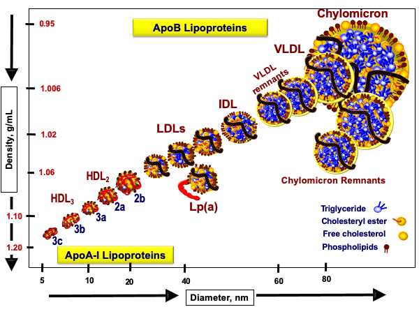 Cholesterol and triglycerides are the major lipids that are transported in plasma by lipoproteins. The liver combines a single apolipoprotein B molecule, triglycerides and cholesterol into an apoB lipoprotein particle (apoB). Plasma concentrations of apolipoprotein B (apoB)–containing lipoproteins are the primary causal determinants of atherosclerotic cardiovascular disease (ASCVD) events. These lipoproteins include low-density lipoprotein cholesterol (LDL-C), remnants, very LDL-C, intermediate-density lipoprotein cholesterol, and lipoprotein a. They contain a variable amount of cholesterol but only one apoB lipoprotein.