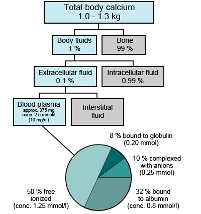 The average adult stores between 1 and 2 kg of calcium, primarily within the skeleton. Only 1% of calcium is present in extracellular fluid. Adult calcium plasma concentrations are normally between 8.5–10.5 mg/dL (2.2–2.6 mmol/L). Most of this circulating calcium is bound to albumin. Because of this, changes in serum protein concentrations can affect total blood calcium concentrations. Ionized calcium is the biologically active fraction and its concentration is tightly regulated by PTH.