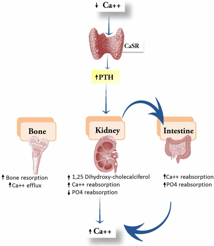 Binding of calcium by CASR in the parathyroid glands results in down regulation of parathyroid hormone (PTH) synthesis, while binding of calcium to the CASR in the kidneys results in upregulation of renal calcium excretion. These simultaneous opposite reactions lead to tight control of plasma calcium levels.
