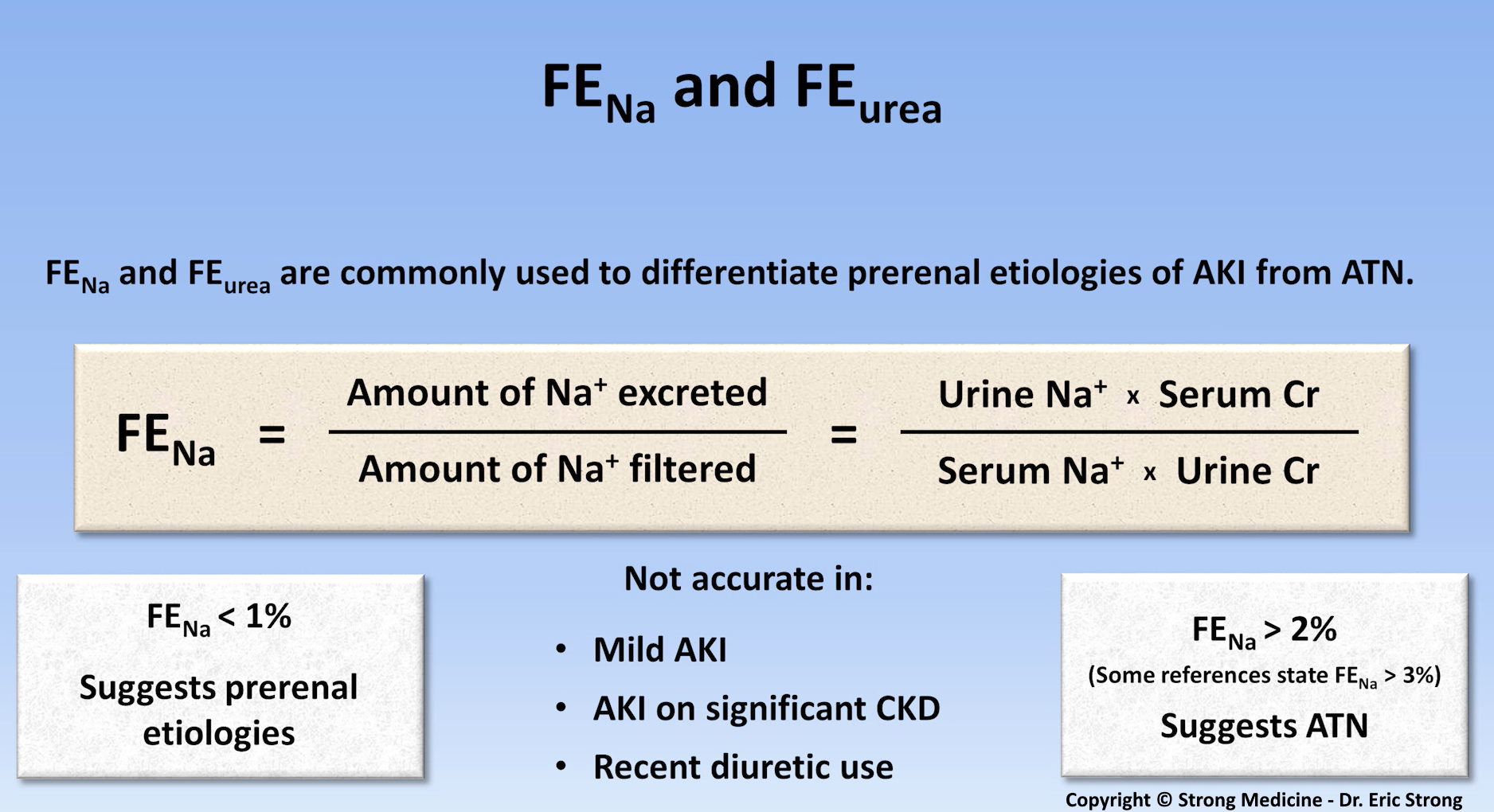 Typically, FEurea is 50 to 65% in ATN and below 35% in prerenal disease. Although still controversial, the preponderance of the evidence suggests that FEurea is more accurate than FENa in patients receiving diuretics.