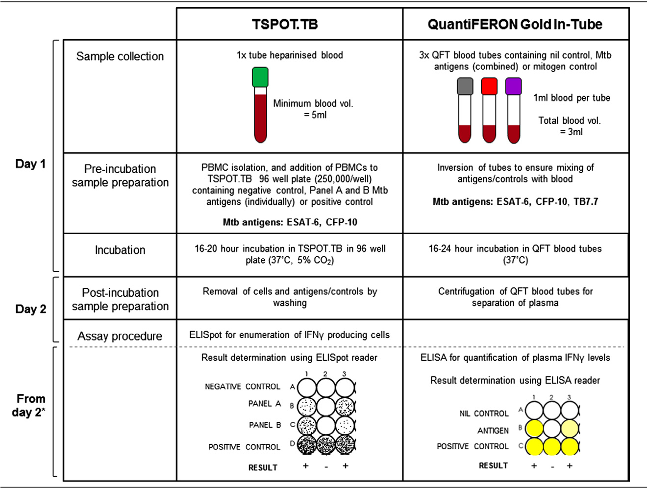 IGRA are based on the principle that individuals who are infected with TB have primed memory T cells, which, upon re-exposure to specific TB antigens, will be activated and stimulated to release interferon-gamma. Hence these assays are designated as interferon gamma release assays (IGRAs). FDA-approved IGRA assays for MTB include QuantiFERON TB Gold Plus (Qiagen) and T-spot TB (Oxford Immunotec) assays. Because these assays quantitate a biologic response, testing of a fresh blood specimen with viable white blood cells is crucial to obtaining accurate results.
