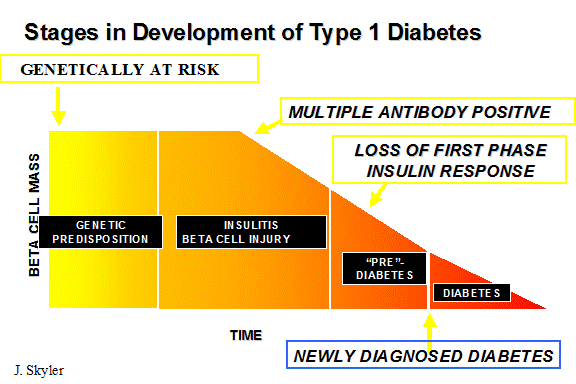 The onset of T1D is preceded by the synthesis of autoantibodies to insulin and islet cell antigens. Detection of one or more islet cell autoantibodies is a strong predictor for progression to type I diabetes. The five-year cumulative risk for developing diabetes has been estimated to be 17% if seropositive for 1 antibody, 39% if seropositive for 2 antibodies, and 70% if seropositive for 3 antibodies. These autoantibodies can often be detected by age 3.