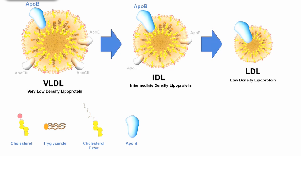 Triglycerides are rapidly removed by the enzyme lipoprotein lipase and used for energy consumption and storage. As triglycerides are progressively removed, the lipoprotein is referred to as a VLDL remnant particle. After most of the triglycerides have been removed, the lipoprotein becomes denser and is referred to as low-density lipoprotein (LDL). The conversion of VLDL to LDL takes approximately 6 hours. It is important to realize that a VLDL particle, a VLDL remnant particle, and an LDL particle are really different names for the same circulating apoB lipoprotein at different stages in its lifecycle, depending on its lipid content.