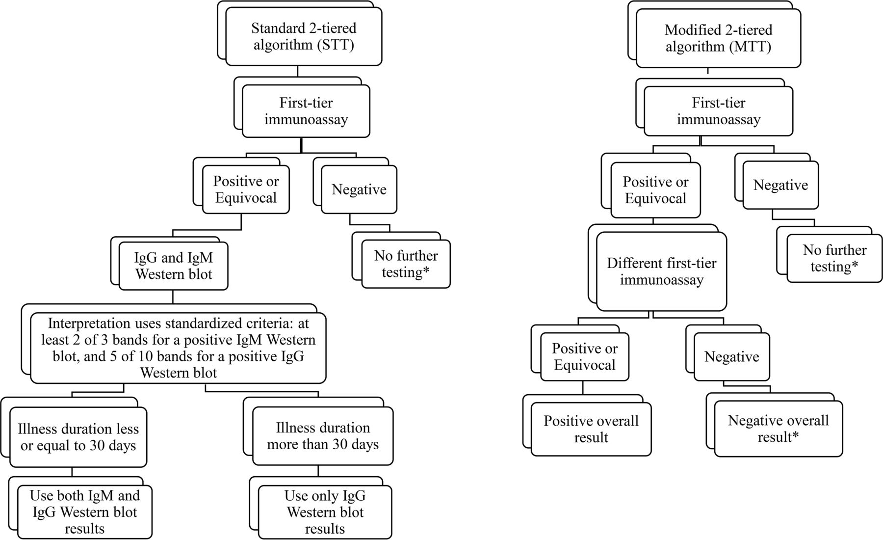 Specimens that test negative on initial screening do not need further testing. In the original two step approach, specimens testing positive by either method were confirmed with a Western blot immunoassay that contained 3 antigens on the IgM blot and 10 antigens on the IgG blot. CDC required reactivity with at least 2 IgM bands and 5 IgG bands for a Western blot to be considered positive.