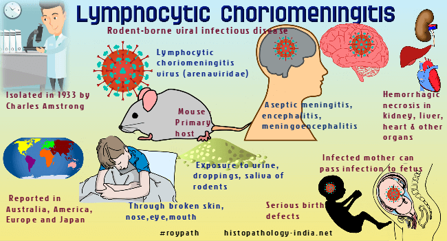 Diagnosis can be established by the detection of LCMV nucleic acids in the CSF during the acute stage of illness or by antibody seroconversion during the acute and convalescent stages. LCMV nucleic acid testing may detect viral ribosomal nucleic acids in the blood or CSF only during the first 2 weeks after phase 1 symptoms begin. An enzyme-linked immunosorbent assay (ELISA) for LCMV is available only at the Centers for Disease Control and Prevention. Serologic testing by immunofluorescent antibody assay, that is available at most commercial laboratories, is less sensitive than ELISA.