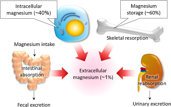 While more than 60% of the body’s magnesium stores reside in bone, nearly 70% of the serum magnesium circulates freely, not bound to plasma proteins. This unbound magnesium is freely filtered at the glomerulus and enters the tubules where more than 95% of filtered magnesium is reabsorbed in the loop of Henle in the kidney.