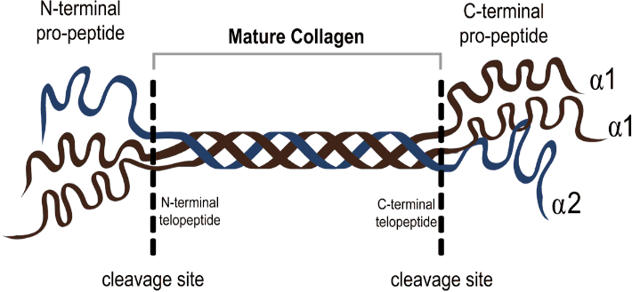 More than 90% of the osteoid matrix of bone consists of type I collagen. Noncollagenous proteins, such as osteocalcin, comprise the remaining 10%. Type 1 collagen is synthesized as procollagen precursor molecules. Prior to insertion into the osteoid matrix, the N and C terminal peptides of procollagen are cleaved and released into the circulation. The N terminal peptide is commonly referred to as N-telopeptide and is one of the most sensitive indicators of bone resorption.