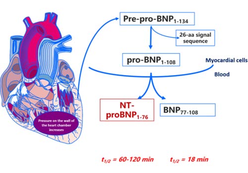 B-type natriuretic peptide, which is also called brain-type natriuretic peptide (BNP), was first isolated from brain, but later discovered to be a cardiac hormone. Ventricular cardiac myocytes constitute the major source of BNP related peptides. Only small amounts of BNP are stored within the cytoplasmic granules of myocytes. Following myocardial wall stress, cardiac myocytes rapidly synthesize prepro-BNP, which consists of 134 amino acids. During secretion from myocytes, a 26 amino acid signal peptide is removed. In the bloodstream, pro-BNP is further cleaved into a 32 amino acid biologically active hormone called BNP and a biologically inactive 76 amino acid N-terminal fragment, called NT-proBNP.