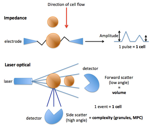 Hematology analyzers utilize either electrical impedance of optical light scatter methods to count platelets. Electrical impedance is coupled with hydrodynamic focusing improve accuracy. Particles between 2 and 20 femoliters (fl) are counted as platelets. Analyzers using impedance are able to provide accurate platelet counts down to 20,000/uL. A major disadvantage of impedance counting is the difficulty in distinguishing large platelets from extremely microcytic or fragmented red cells. Falsely increased platelet couonts occurs when red cell or white cell fragments, microcytic red cells, immune complexes, or cell debris is included in the reported count. Falsely low platelet counts occur in the presence of large platelets or platelet clumping.