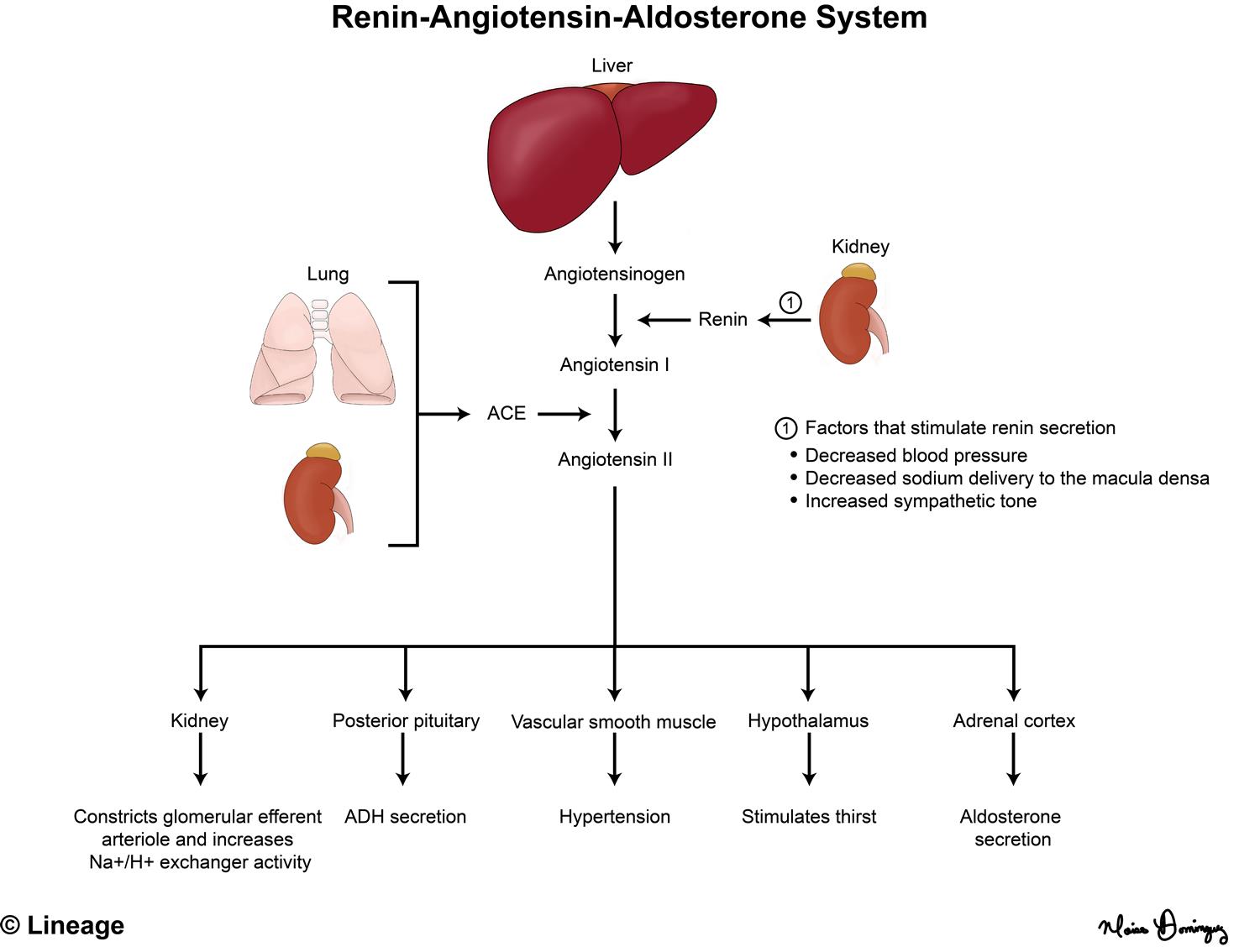 Renin catalyzes the formation of angiotensin I by proteolytic cleavage of angiotensinogen, a glycoprotein synthesized in the liver. Angiotensinogen concentration is the limiting factor in angiotensin II production. Increased levels of thyroid hormone, estrogen and glucocorticoids increase angiotensinogen. Angiotensin-converting enzyme (ACE) converts angiotensin I to angiotensin II, which regulates renal blood flow and glomerular filtration. Increased concentration of angiotensin II promotes aldosterone release and inhibits renin secretion by a negative feedback mechanism. Renin secretion increases in response to decreased renal artery perfusion, reduction in distal tubular resorption of sodium ions, hypokalemia or stimulation of β-adrenergic receptors. The renin-angiotensin-aldosterone system (RAAS) plays an important role in water homeostasis, electrolyte balance, and regulation of arterial pressure. Measurement of both plasma renin and aldosterone concentrations is used to assess the RAAS function.