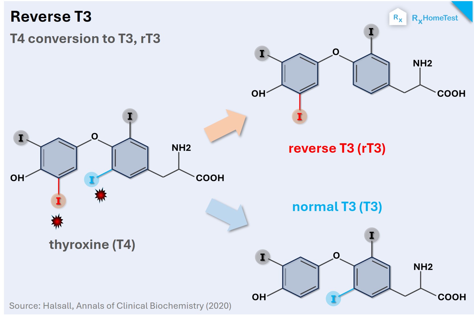 Triiodothyronine (T3) is a thyroid hormone that is created by deiodination of thyroxine (T4) by type 1 and type 3 deiodinase enzymes. T3 reverse is a biologically inactive form of T3 that is produced inside the cells of other tissues from the breakdown of T4. High concentrations of T3 reverse may block T3 binding to the thyroid hormone receptor.