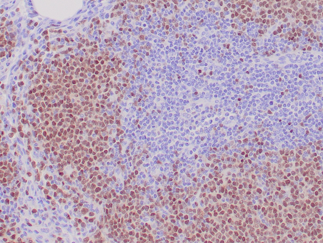 Diagnosis and separation of mantle cell lymphoma (MCL) from other small cell non-Hodgkin lymphomas is important because it is considered one of the most aggressive lymphomas which often requires high-dose chemotherapy and potential autologous stem cell transplant, especially in younger patients. MCL accounts for 3 to10% of non-Hodgkin lymphomas. The characteristic lesion defining MCL is a IGH/CCND1 translocation, resulting in up-regulation of cyclin d1 protein. Detection of cyclin d1 by immunohistochemistry and/or demonstration of IGH/CCND1 gene fusion by fluorescence in situ hybridization (FISH) is imperative for diagnosis.