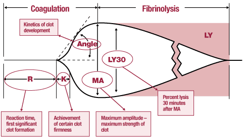 - LY30 – LY30 measures the rate of amplitude reduction 30 minutes after the MA is reached. It represents the degree of fibrinolysis and breakdown of the clot during this time interval. Fibrinolysis increases the value of LY30, while the use of antifibrinolytic agents, such as Amicar, will shorten it.
