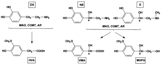Metanephrine and normetanephrine are metabolic products of epinephrine and norepinephrine. Norepinephrine is synthesized from tyrosine via dopa and dopamine in the brain, chromaffin tissue, and sympathetic nerve endings. Epinephrine is formed from norepinephrine in adrenal chromaffin cells. Both compounds are inactivated by catechol-O-methyl transferase to form normetanephrine and metanephrine. Some normetanephrine and metanephrine is converted to vanillylmandelic acid (VMA), which is the end product of catecholamine catabolism. VMA is excreted in urine in the free form. Urine contains small amounts of catecholamines and much larger amounts of metanephrine, normetanephrine, and VMA.